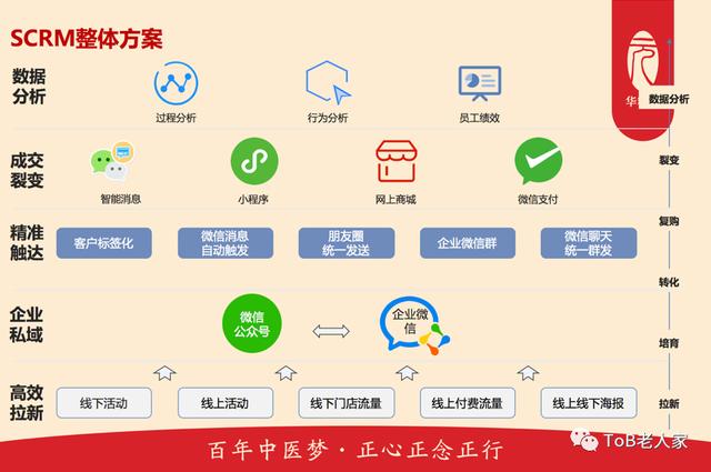 以上是我任职公司消费者板块的SCRM系统整体方案图。通过将员工工作平台、会员服务平台、新客引流平台都搭建在微信体系,可以实现从拉新、培育到转化、复购的营销全过程数字化管理。